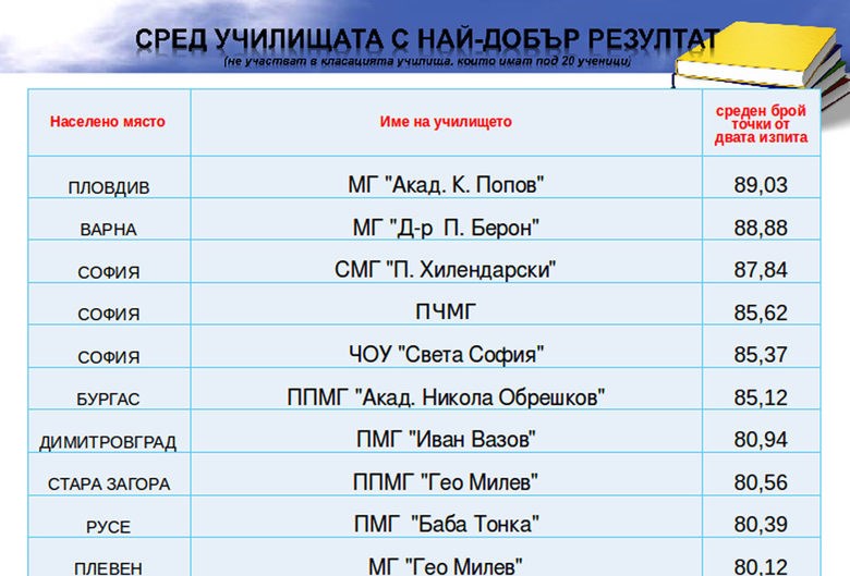В първата десетка (вижте списъка по-долу - бел. авт.) са само математически и природоматематически гимназии, но не и езикови, тъй като в тях няма прием след 5 клас.