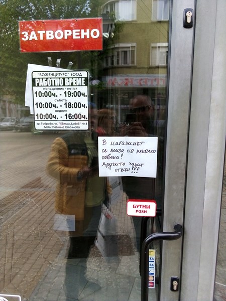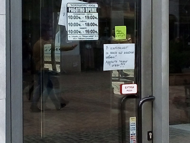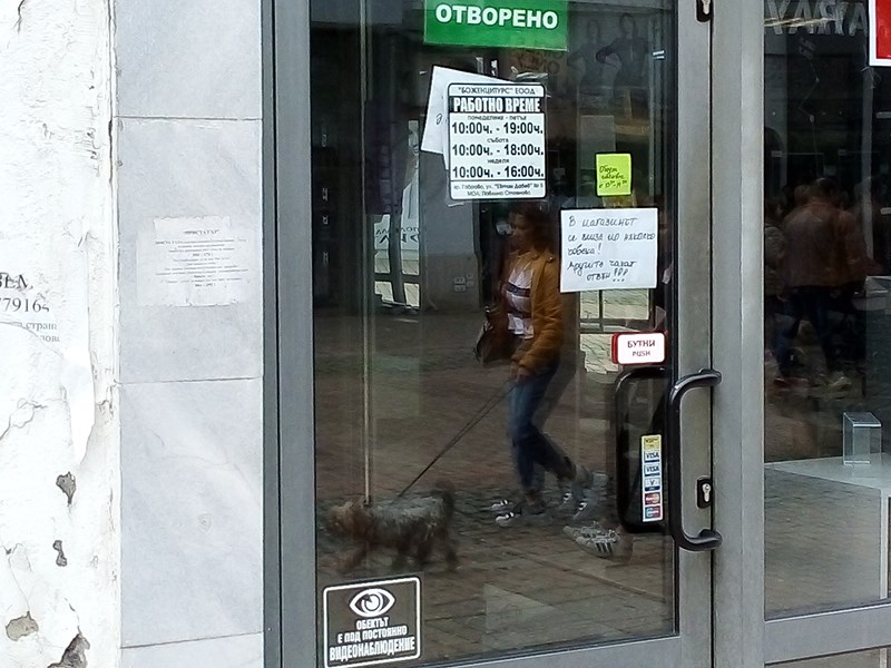 Магазинът за обувки "Кавалер" на улица "Александровска" в Русе посреща клиентите си с надпис "В магазинът се влиза по няколко човека. Другите чакат отвън!!!"