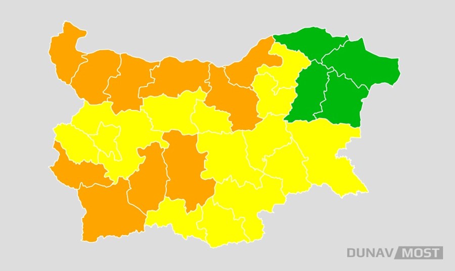 Останалата част от страната също няма да избегне жегите. В по-голямата част от България е обявен жълт код, където температурите ще бъдат между 34° и 37°. Единствено четири области в Североизточна и Източна България – Силистра, Добрич, Шумен и Варна – ще останат по-хладни с температури между 30° и 34°.