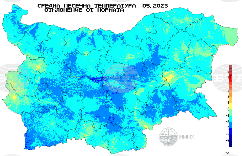 Месец май е относително студен или с температури близки до климатичната норма. Средните месечни температури имат отклонение от нормата между 3 и +0,3 °С. Това е най-студеният месец май от 2005 г. насам. Най-високата измерена температура е 29,9 °С в Русе на 25.V, а най-ниската – -0,2 °С в Добрич на 11.V. Месечните суми на валежите са около климатичната норма, но в широки граници – между 13 и 181% от нормата. Най-голямото измерено 24-часово количество валеж е 56,7 mm в с. Балван, обл. Велико Търново, на 30.V.