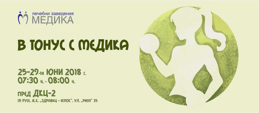 Лечебни заведения „МЕДИКА“ стартират кампанията „В ТОНУС С МЕДИКА“. Инициативата цели провокиране на сутрешна физическа активност в забързаното ежедневие на русенци. С развитието на технологиите, ние все по-често пренебрегваме важната роля на движението. Започваме да водим заседнал начин на живот, който от своя страна води до редица заболявания. „Разчупването на черупката“ е свързано с излизане от зоната на комфорт и създаване на нови навици. Добър старт към здравословния начин на живот би била 30-минутна сутрешна гимнастика с плавни движения.