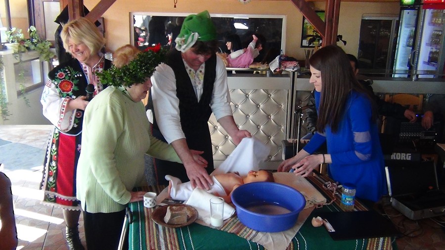 Група от жени, облечени в национални носии, се отправиха към Здравната служба. През целия път под звуците на духова музика участниците в шествието пяха и играха ръченица. Заедно с тях вървеше и родилка с три деца. С танци бабите дойдоха до здравното заведение, където ги посрещна най-възрастната акушерка в селото. Цветанка Трифонова повече от 40 години от живота си е отдала на майките, на израждането и отглеждането на техните рожби. Родилката предаде бебето на акушерката, за да го претегли с колко е наддало през последния месец. По стар обичай на акушерката бяха връчени венец и клонче от дрян с паричка за здраве. Признателни майки отправиха благодарност към здравните работници за положените грижи за подрастващите. Беше спазена традицията акушерката да седна в шейна, теглена от преоблечен като елен мъж, след което церемонията се отправи към ресторанта, за да продължи изпълнението на празничните ритуали.