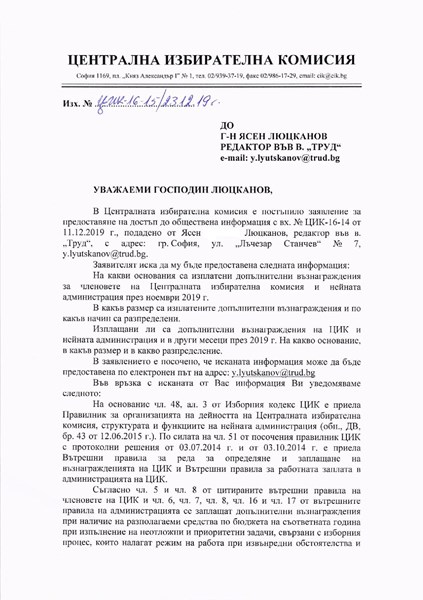 Това отговориха председателят на ЦИК Стефка Стоева и секретарят на комисията Севинч Солакова на въпроси на “Труд”, зададени по реда на Закона за достъп до обществена информация.