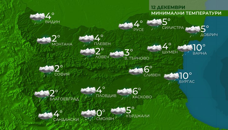 На места ще има слаби превалявания от дъжд, в сутрешните часове - в Предбалкана и по високите полета - и от сняг. Минимални температури - между 2° и 11°, максимални – между 6° и 13°. Ще духа слаб, в източните райони - до умерен североизточен вятър.