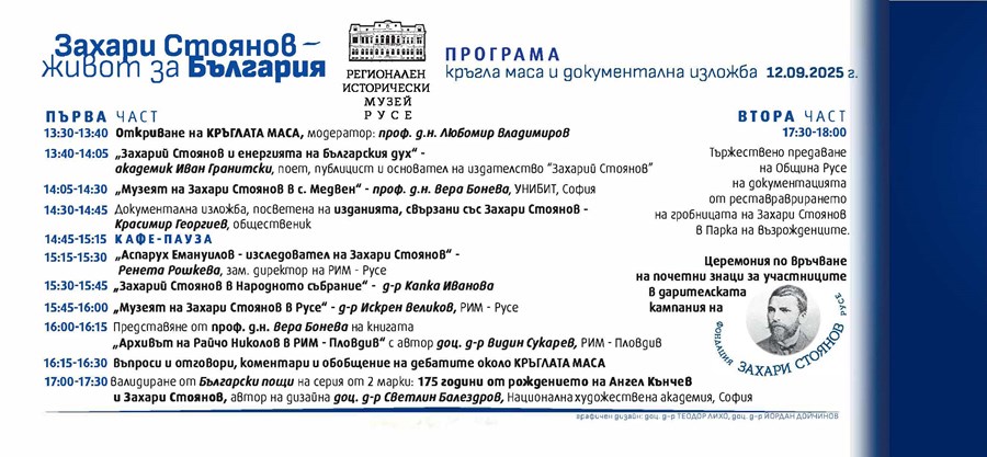 В Регионалния исторически музей в Русе ще се проведе кръгла маса на тема „Захари Стоянов – живот за България“. Събитието ще започне в 13:30 часа на 12 септември, петък. Форумът е посветен на 175 години от рождението на бележития български революционер, писател и общественик и 140-ата годишнина от Съединението на Княжество България и Източна Румелия.