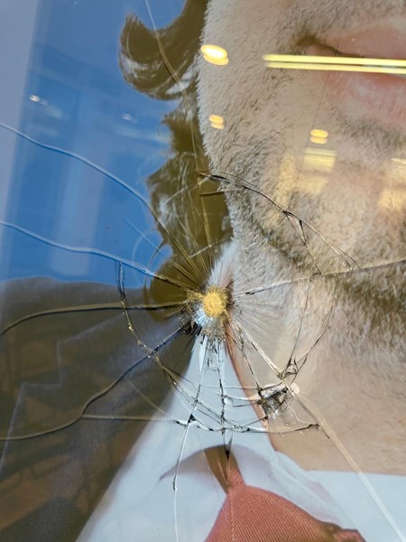 Илиев споделя: "Поради залепените ПВЦ пана отвън щетите не си личат, но от вътрешната страна ясно се виждат пораженията. Предполага се че са били причинени от стрелба с въздушна пушка. Пострадали са два от панорамните прозорци."