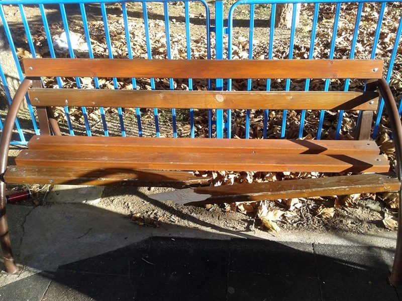 Възмутена съм. Чисто нова пейка и счупена. Не стига, че пейките в парка се местят и чупят безнаказано, а сега това се случва и на площадките.