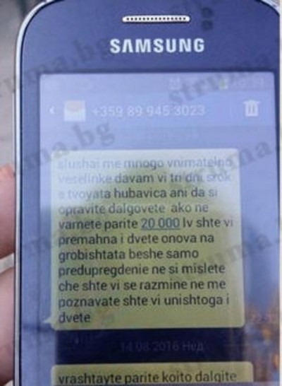 "Слушай ме много внимателно, Веселинке, давам ви три дни срок твоята хубавица Ани да си оправи дълговете, ако не ми върнете 20 000 лева, онова с гробищата е само предупреждение, не си мислете, че ще ви се размине, ще ви унищожа и двете."