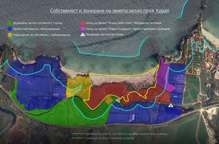 По данни от кадастъра, дюни в имота няма и той попада в зона А от Закона за устройството на Черноморското крайбрежие, която на теория трябваше да опази брега от застрояване. Реално обаче законът позволява строителство с плътност на застрояване до 20%, интензивност на застрояване (К инт.) до 0.5 и минимална озеленена площ 70%.