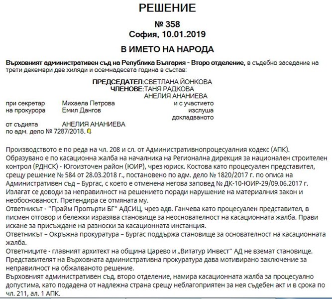 Става дума за проекта „Корал Резидънс” на „Прайм Пропърти БГ” за ваканционен комплекс. Решението е от 10 януари 2019 г. и отхвърля жалба на РИОСВ-Бургас за липса на оценка на въздействието на околната среда (ОВОС) и оценка за съвместимост по Закона за биологичното разнообразие.