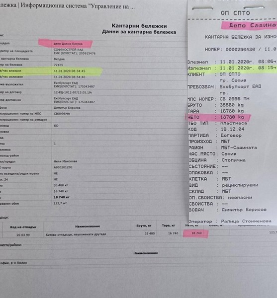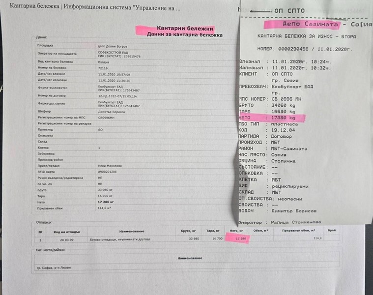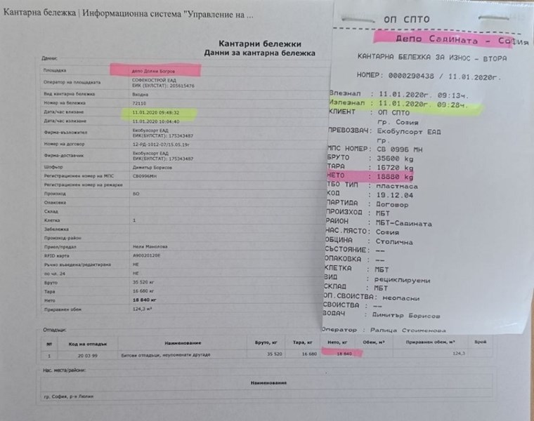 Освен датата, часа и количеството в установените курсове, съвпадение има и с името на фирмата, която е изнесла отчетения като рециклируем материал, както и регистрационните номера на камионите, извършили курсовете.