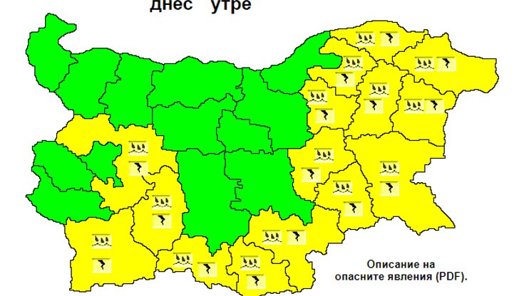Заради очакваното опасно време за 10 области на страната, сред които Шумен, Търговище, Силистра и Разград днес е в сила предупредителен жълт код. Той е за обилни валежи.