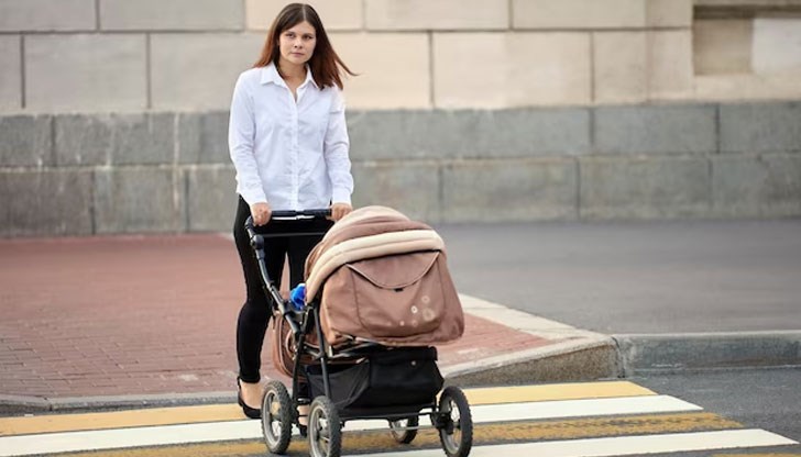 Младата жена пресичала с детето си на натоварено кръстовище в града с изтрити пешеходни пътеки.