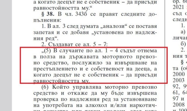 След гласуването на промените медиите обърнаха внимание основно на увеличените наказания при причинена смърт на пътя, и новата алинея 5 към член 343б мина незабелязано. Тя гласи: "В случаите по ал. 1 - 4 съдът отнема в полза на държавата моторното превозно средство, послужило за извършване на престъплението и е собственост на дееца, а когато деецът не е собственик - да присъди равностойността му". Ето и кои са четирите случая, описвани във въпросните алинеи, при които се стига до конфискация на автомобила: