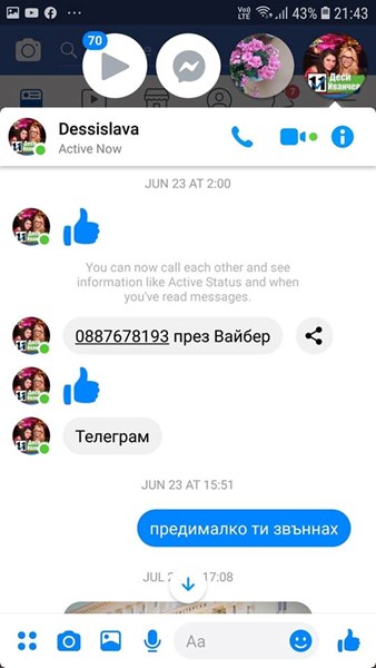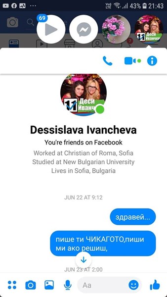 Първо : чатовете се провеждат от името на Venyslav към Desislava , а моят профил се изписва - Ventsislav Angelov , а на Десислава Иванчева - Dessislava Ivancheva...!!!
