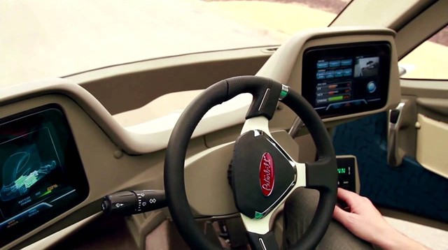 Нетрадиционна е и вътрешната архитектура на кабината. Водачът седи в средата на купето, обкръжен щедро остъкление и дисплеи. За изработката на каросерията е използван кевлар, благодарение на който влекачът тежи почти 2 тона по-малко.