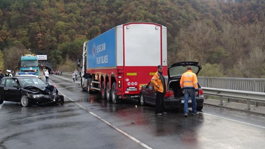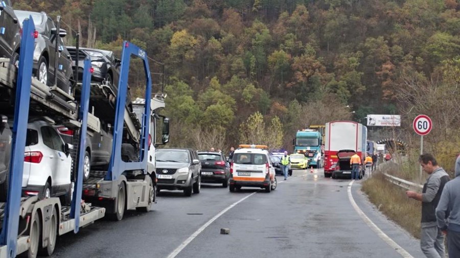 Товарен и два леки автомобила са се ударили на излизане от тунела при село Железница, като пътят е затворен, предаде БГНЕС.