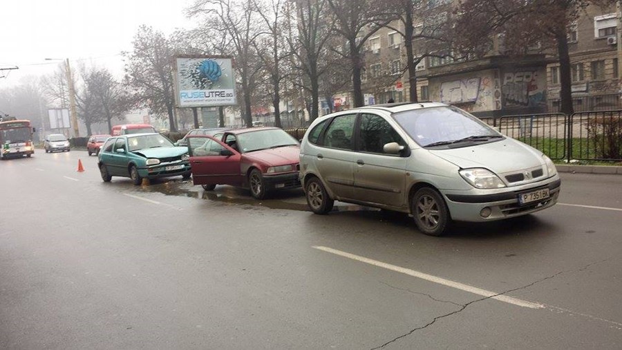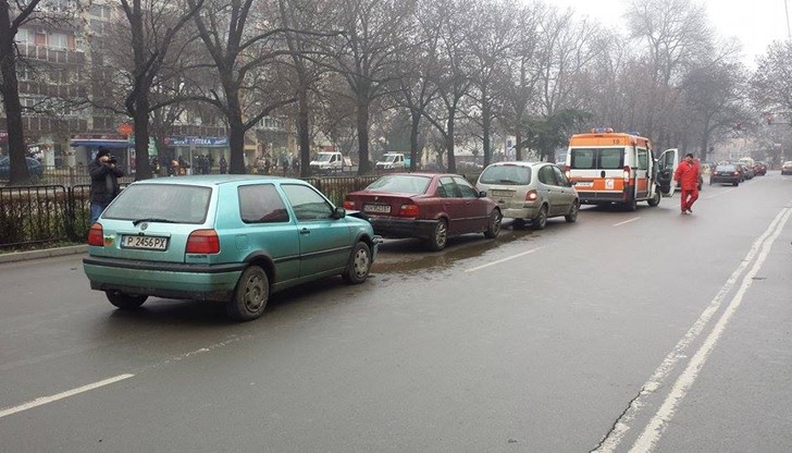 Лек автомобил „Рено“ ударил спирачки, в него се блъснало БМВ, в него – „Фолксваген Голф“.