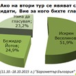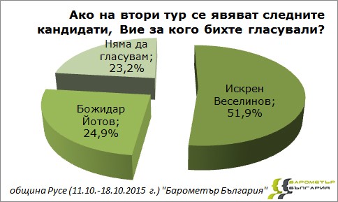Това се показва и от тествания балотаж между Стоилов и Веселинов, в който анкетираните русенци определят Искрен Веселинов от Патриотите-ВМРО за победил, като за него биха гласували 40,5%. При такъв вариант Пламен Стоилов от ГЕРБ би получил подкрепата на 32,4%, а 27,1% от русенци не биха гласували.