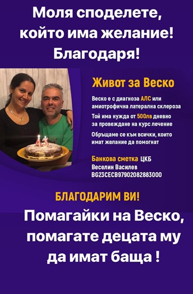 "Обръщам се с молба към всички, които имат желание и възможност да помогнат да направим адекватно лечение. Благодаря предварително!", допълва Веселин.