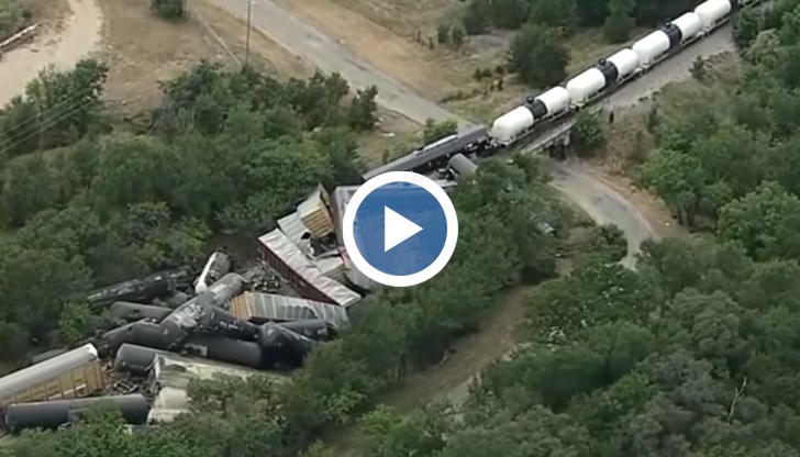 Кадри от въздуха показват множество претрупани влакови вагони, натрупани един върху друг край железопътната линия в селския район. Екипи на "Юниън Пасифик" са на път към мястото за овладяване на ситуацията.