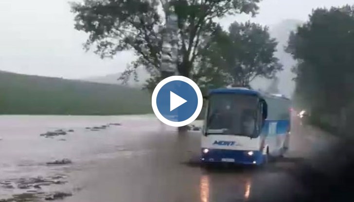 На кадри от видео се вижда залято от обилния дъжд пътно платно, което буквално е непроходимо за леки автомобили.
