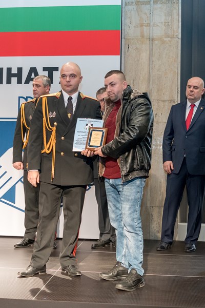 За проявена гражданска позиция, в качеството си на длъжностно лице - охрана на общежитие, реагира адекватно и професионално, като спомага за евакуирането на 22 живущи в общежитие, обхванато от пламъци.