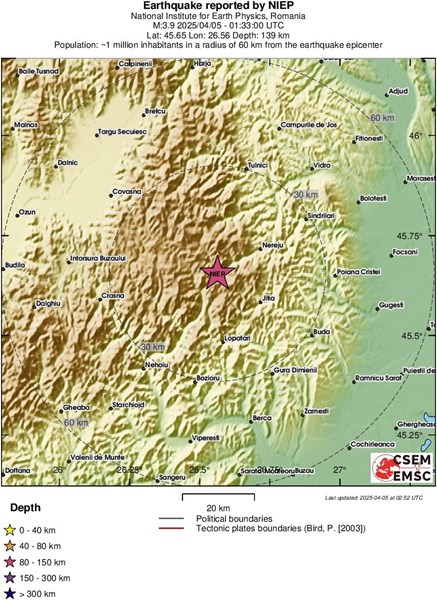Земетресение с магнитуд 3.9 бе регистрирано в сеизмичната зона Вранча, Румъния. Според информация на Института за национални изследвания и развитие по физика на Земята (INCDFP), земетресението е станало на 5 април 2025 година в 04:33 часа местно време на дълбочина от 139.9 километра.