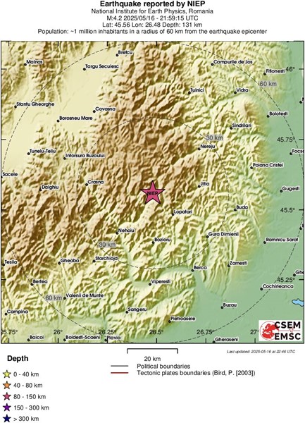 През нощта на 17 май 2025 г., точно в 00:59 часа (местно време за Румъния), сеизмичната зона Вранча беше разтърсена от земетресение с магнитуд 4.2 по скалата на Рихтер. Трусът е регистриран на значителна дълбочина от 131.9 километра, което е характерно за тази активна сеизмична област.