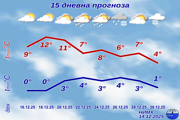 Слънчево и тихо време ще ни радва през първата половина на 15-дневния период, но краят на 2025 година ще донесе рязка промяна с валежи от дъжд и сняг. Това сочат данните от дългосрочната прогноза на метеоролозите за втората половина на декември.