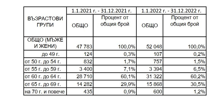 Както през 2021 г., така и през 2022 г., с най-висок относителен дял на новите пенсионери е възрастовата група „от 50 до 59 години“ - 42,1%. Намалява делът на новоотпуснатите пенсии в групата „от 60 до 64 години“.