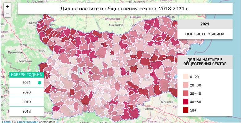 В 205 общини делът на наетите в обществения сектор остава непроменен или се увеличава за периода след 2018 г., като най-видим е ръстът в Добрич-селска община (17 пр.п), Симеоновград (14 пр.п.) и Хитрино, Пордим и Аврен (по 11 пр.п.). Спад е отчетен в едва 52 общини, но в 30 от тях то е с под 2 пункта. Повишаването на дела на наетите в публичния сектор е част от по-дългосрочна тенденция, като годината на пандемия значително ускори тези процеси.
