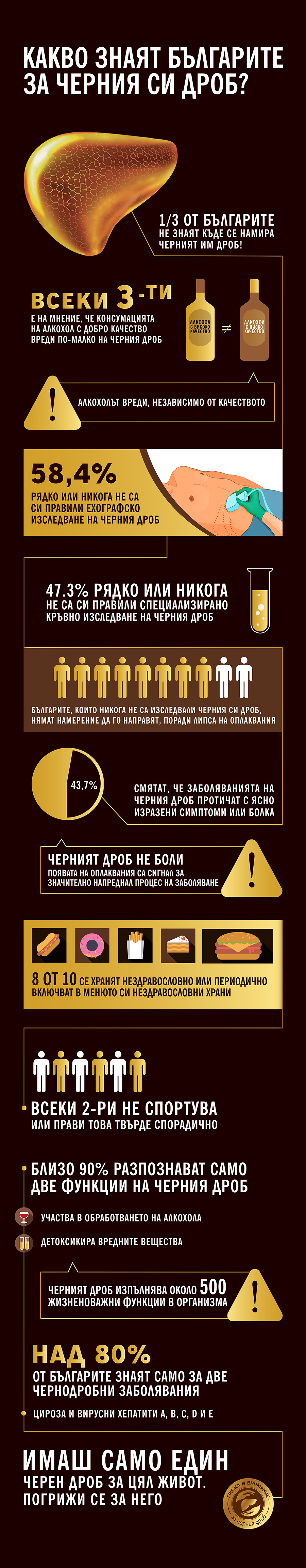 Всеки трети българин погрешно смята, че колкото е по-качествен алкохолът, който се приема, толкова е по-малък рискът от чернодробно заболяване. Освен спиртните напитки изследваните лица възприемат затлъстяването (83.8%), лекарствата (85.2%), мазната храна (81.2%), наркотичните вещества (77.3%) и заседналия начин на живот (63.5%) като фактори, които имат пагубно влияние върху състоянието на черния дроб. В същото време 8 от 10 българи споделят, че се хранят нездравословно или периодично включват в менюто си нездравословни храни, а всеки втори – че не спортува активно. Въпреки, че не спазват подходящ хранителен режим, който подпомага функциите на черния дроб и всеки втори не спортува, 64% от всички запитани никога досега не са приемали медикаменти и хранителни добавки (за профилактика), свързани с подпомагане функциите на черния дроб.