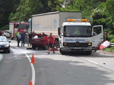 По първоначални данни лекият автомобил е навлязъл в лентата за насрещно движение, където се е блъснал челно в товарния.