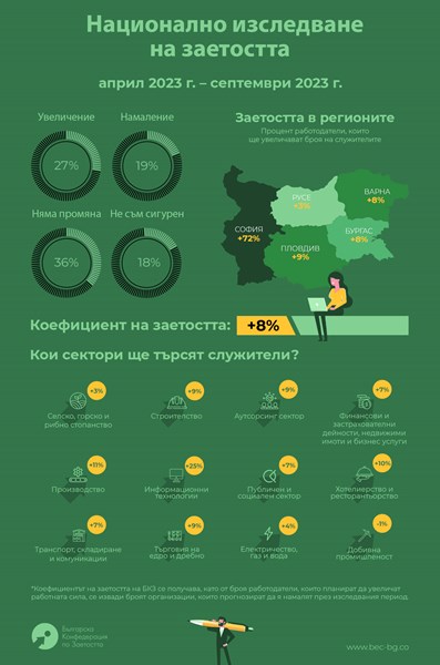 В секторите „Търговия на едро и дребно”, „Транспорт, складиране и комуникации” и „Селско, горско и рибно стопанство” коефициентът на заетост е съответно +9%, +7% и +3% — спад от един процентен пункт в сравнение с предишното шестмесечие. Темпът на наемане на служители в сектор „Електричество, газ и вода” се запазва (+4%), коефициентът на заетост в секторите „Производство” и „Финансови и застрахователни дейности, недвижими имоти и бизнес услуги“ се увеличава с един процентен пункт и достига съответно +11% и +7%, а сектор „Добивна промишленост“ е единственият, който прогнозира отрицателен коефициент на заетост за периода април 2023 г. – септември 2023 г.