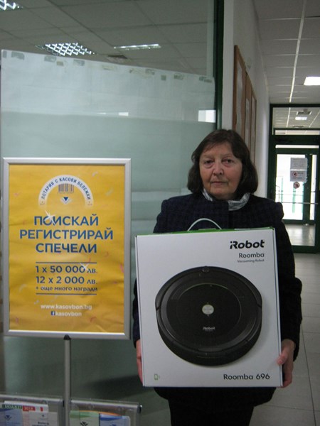 Един модерен робот-прахосмукачка зарадва г-жа Мариана Нецова за регистрираната от нея касова бележка за 1,79 лв. Пенсионираната учителка от професионалната гимназия по електротехника направила малка покупка в магазин за хранителни стоки, но за наградата е важна не стойността във фискалните бонове, а редовното им изискване от продавачите и ежеседмичното им регистриране за лотарията. За инж. Нецова това не са трудности, защото 25 години е преподавала електротехника и електроника и се справя с компютри и смартфони, а и както сама се шегува - винаги може да се консултира с 4-годишния си внук, който вече е виртуоз на съвременните апаратури…