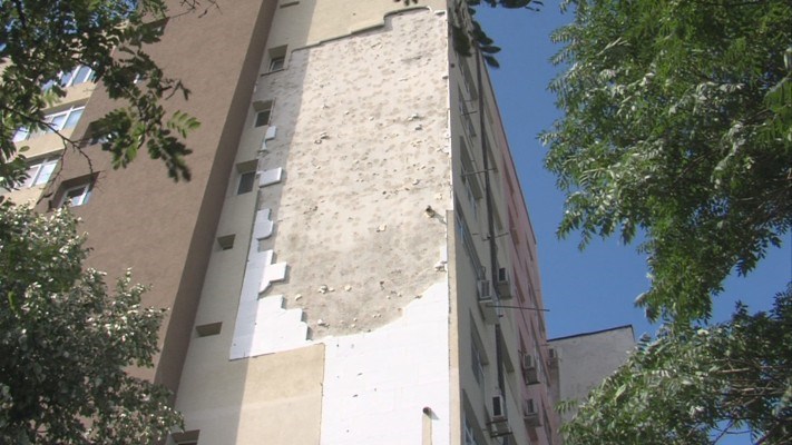 Тази сутрин живеещите в блок 8 в благоевградския квартал „Запад“ чуват силен шум и разбират, че едната стена от блока им е останала без изолация. По чудо парчетата не са ударили минаващи край блока хора или паркирани автомобили.