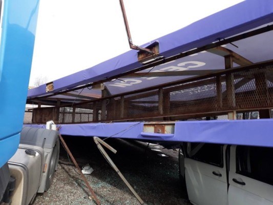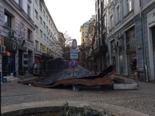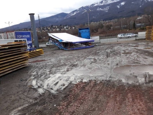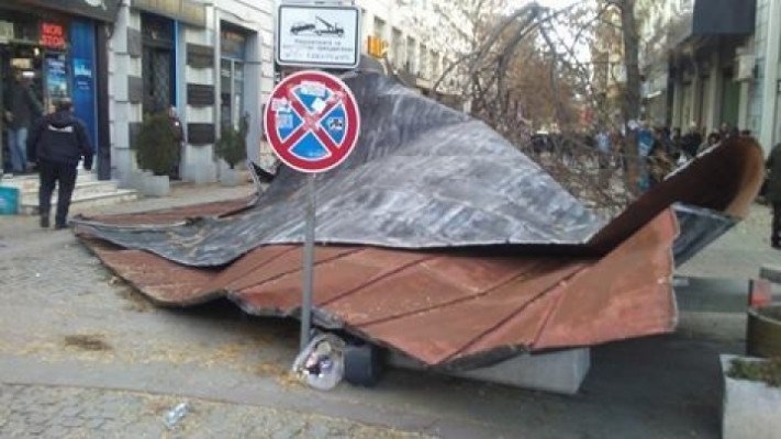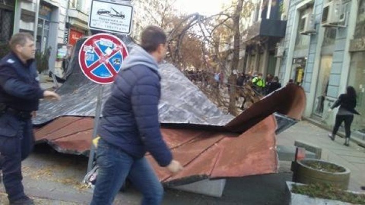 На ул. „Пиротска” вятърът отнесе част от ламаринен покрив на сграда на Халите. По чудо няма пострадали. Улицата към този момент е затворена за преминаване. Откъртени са и климатици. Виси и част от покрива на съседна сграда, предаде bTV.