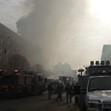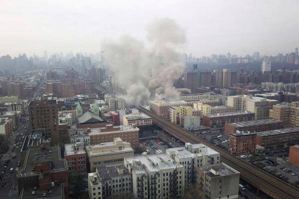 Срутената сграда е 6-етажна. Над нея се издига гъст дим, който се вижда от няколко километра разстояние.