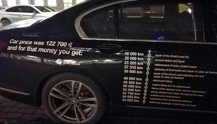 Недоволен собственик на почти ново BMW 750i G11 от Естония протестира срещу постоянните повреди на колата с грижливо изписан върху каросерията списък на дефектите и поправките.