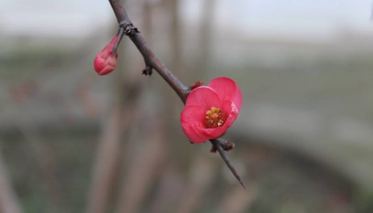 Декоративен храст - японска дюля цъфна в Търговище през февруари.