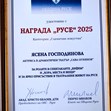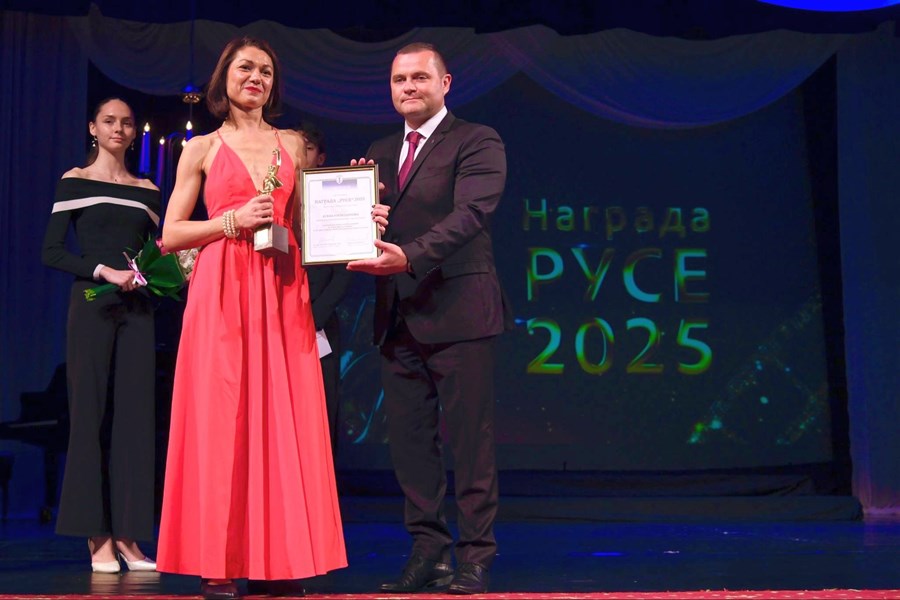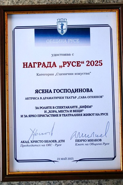 Актрисата от Драматичен театър "Сава Огнянов" Ясена Господинова спечели наградата "Русе 2025" в направление "Сценични изкуства". Церемонията се състоя снощи в Голяма зала на Доходното здание.