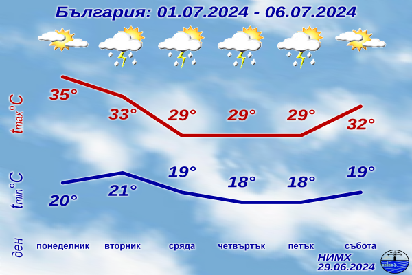 Има повишена вероятност на отделни места валежите да са интензивни и значителни по количество. Температурите ще се понижат и в средата на седмицата преобладаващите максимални ще са между 27° и 32°. В събота ще бъде предимно слънчево, температурите бързо ще се повишат.