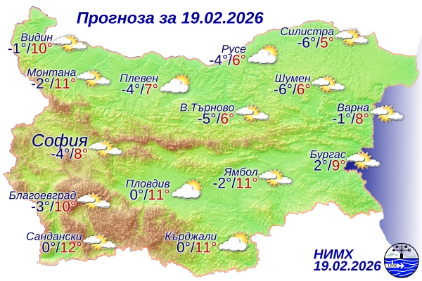 След снежните бури и силния вятър вчера, днес, 19 февруари (четвъртък), времето в България ще бъде предимно слънчево. Въпреки очакваното затопляне обаче, Северна България и дунавският регион остават с чувствително по-ниски температури спрямо южните райони на страната, сочи прогнозата на Националния институт по метеорология и хидрология (НИМХ).