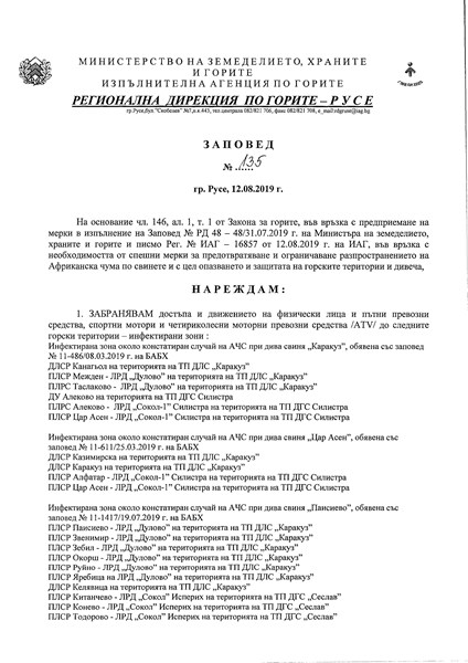 Община Русе разпространи Заповед №135/12.08.2019 г. на Регионална дирекция по горите Русе - забрана за достъп до горски територии във връзка с африканската чума.