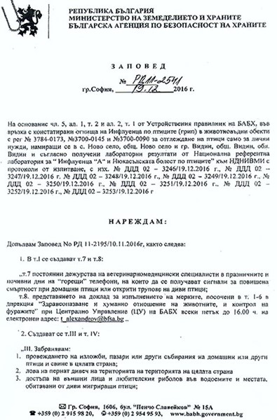 Заповедта е родена в мозъка на някой си началник от Българската агенция за безопасност на храните, а причината – констатирани огнища на Инфлуенца по птиците (грип). В някакъв курник в Ново село, Видинско, кокошките се разболели от птичи грип, както разбираме от документа, пише bigfish.bg
