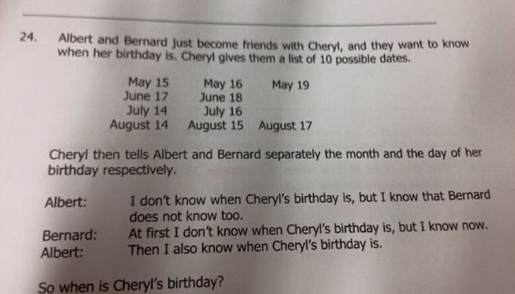 Албърт и Бърнард се запознали с Черил и поискали да узнаят рождения ѝ ден. Черил им дала 10 възможни дати. Те са: