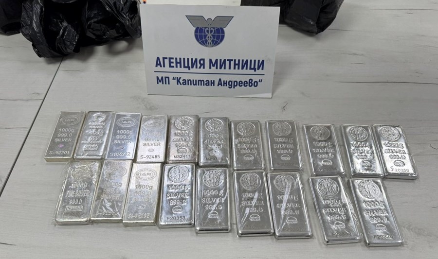 Двадесет килограма контрабандни сребърни кюлчета задържаха митническите служители на пункт Капитан Андреево при проверка на лек автомобил с българска регистрация. Това е най-голямото количество контрабандно сребро, открито в лек автомобил на пункта от началото на годината, съобщи Агенция "Митници".