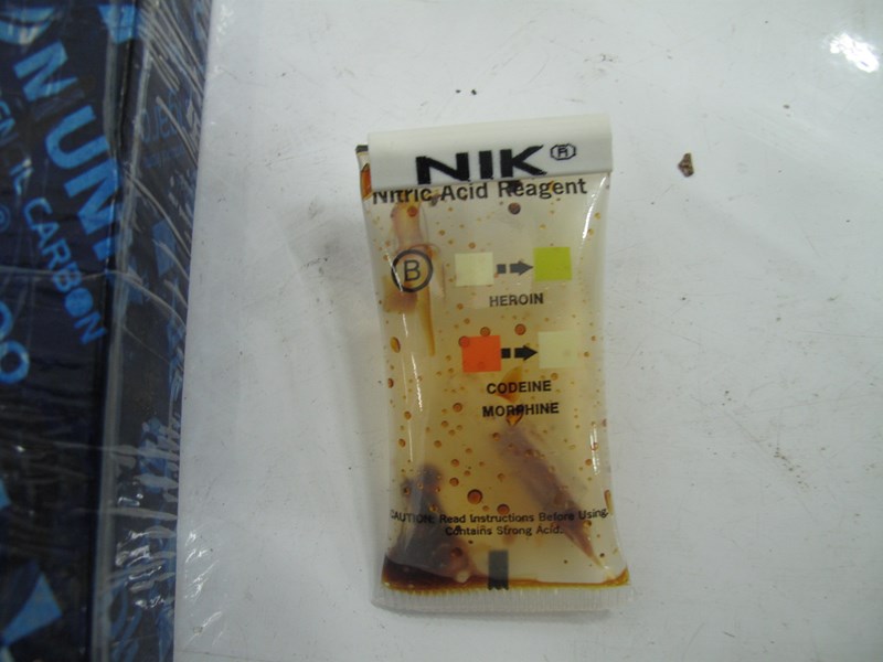 В областта на багажника е установен добре замаскиран тайник зад регистрационния номер на колата. Под ръководството на дежурен разследващ полицай от ГПУ Видин и в присъствието на шофьора на колата, от тайника са извадени 10 правоъгълни пакета, обвити с индиго и облепени с тиксо. Общото тегло на извадените пакети е 5090 грама. Съдържанието на пакетите е проверено с полеви наркотест, който е реагирал на хероин.