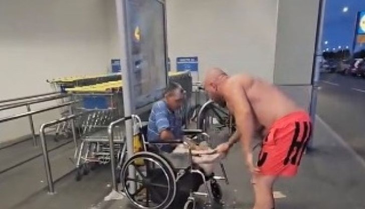Динко Вълев от Ямбол е задържан от полицията заради агресивно поведение, след като на клип, публикуван в в социалните мрежи, се вижда как блъска, плюе и удря шамар на мъж представящ се за инвалид и просещ пред хипермаркет в Равда.